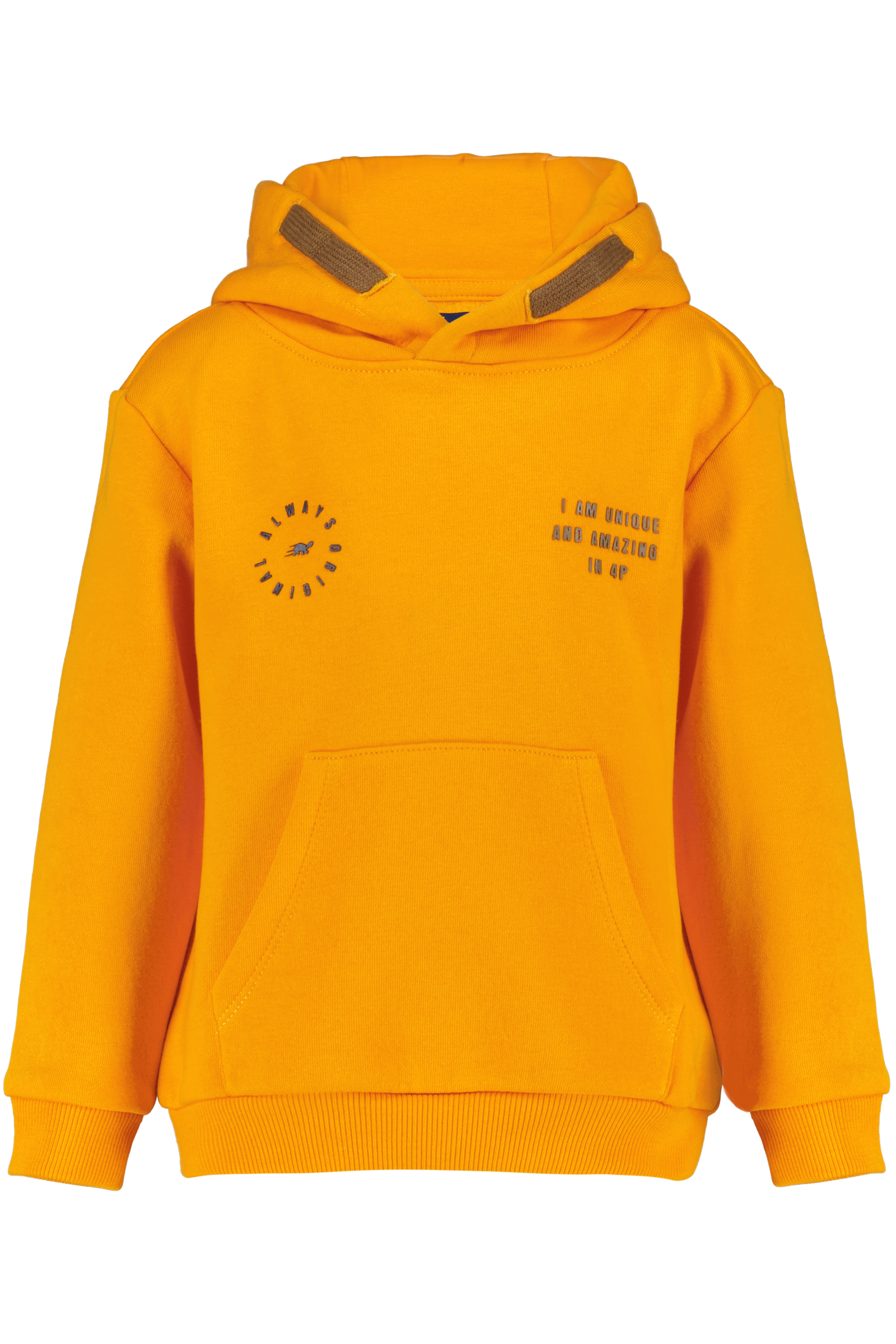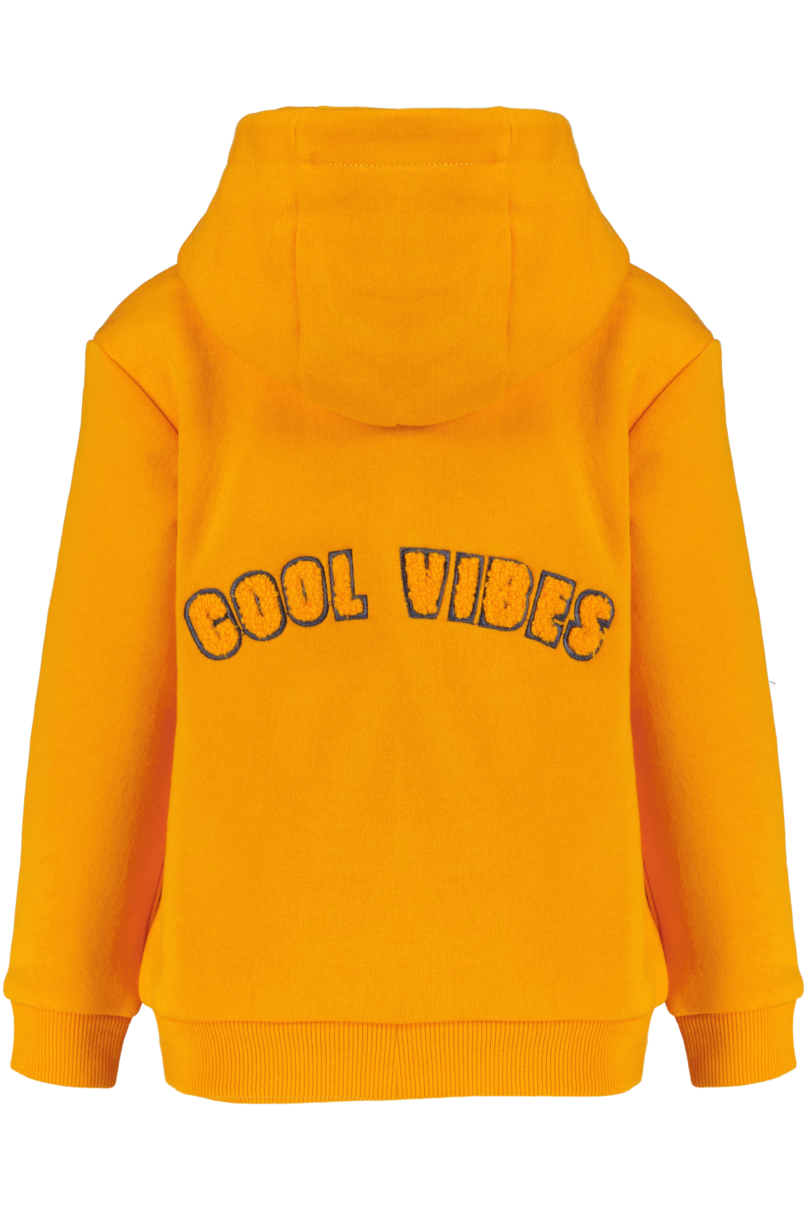 Felkleurige oranje (abrikoos) trui voor jongen. Met tekst opdruk voor en achterkant.