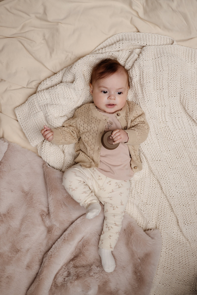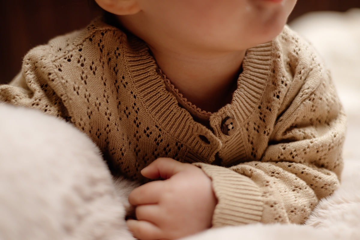 Taupe gebreid vestje met patroontje.